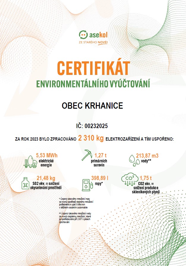 Jakým rozsahem v roce 2024 naše obec Krhanice (tedy naši občané) přispěla k lepšímu životnímu prostředí, se dozvíte z environmentálního certifikátu: