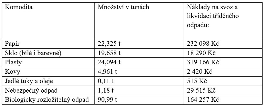 Svoz tříděného odpadu (plasty, kartóny od nápojů, papír, sklo, jedlé oleje a tuky, hliníkové nápojové plechovky, železo a elektroodpad) probíhal průběžně.