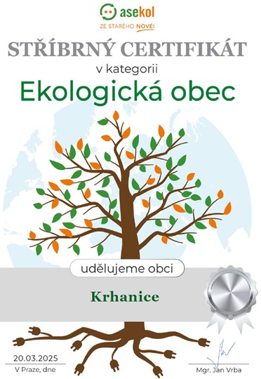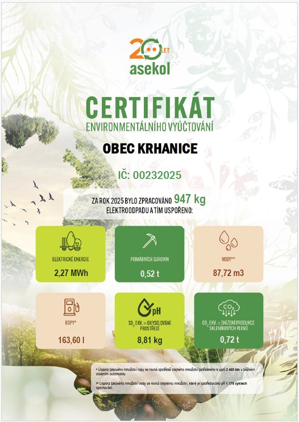 Jakým rozsahem v roce 2025 naše obec Krhanice (tedy naši občané) přispěla k lepšímu životnímu prostředí, se dozvíte z environmentálního certifikátu: