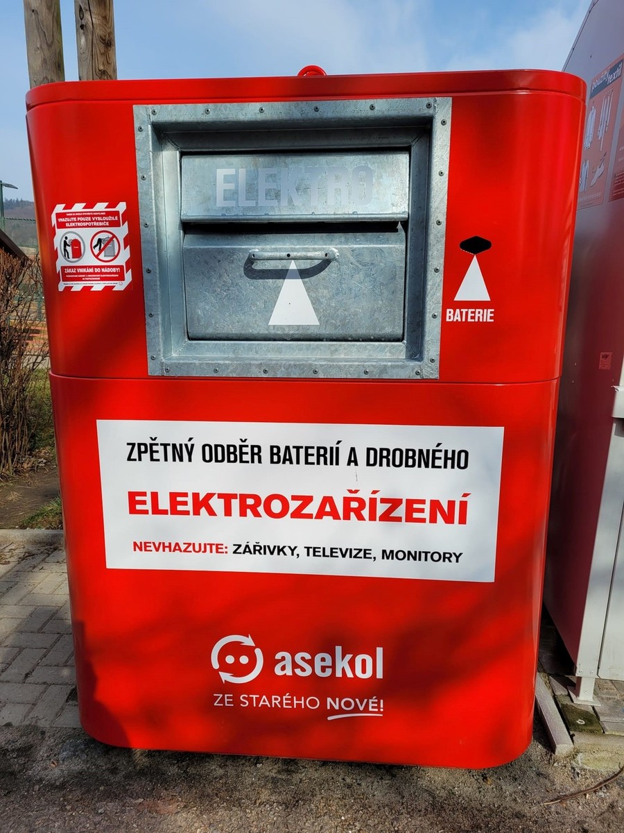 LZE UKLÁDAT: Textil. Doporučujeme vhazovat v igelitových taškách či jiných obalech. ČERVENÝ KONTEJNER NA ZPĚTNÝ ODBĚR DROBNÉHO ELEKTROZAŘÍZENÍ A BATERIÍ