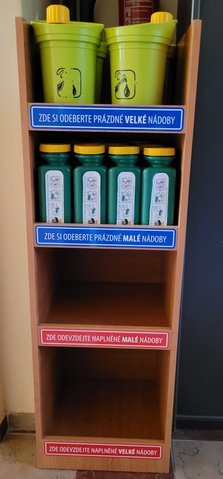 V přízemí na chodbě obecního úřadu je skříňka, ve které jsou volně k odběru 2 druhy nádob. Do této skříňky se také odkládají nádoby s použitým olejem a tuky.